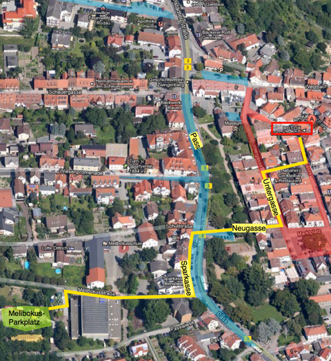 Der Fussweg geht an der Sparkasse vorbei, Pass, durch die Neugasse, links in die Untergasse, rechts in die Mittelgasse und wieder ein kleines Stück links in die Obergasse.